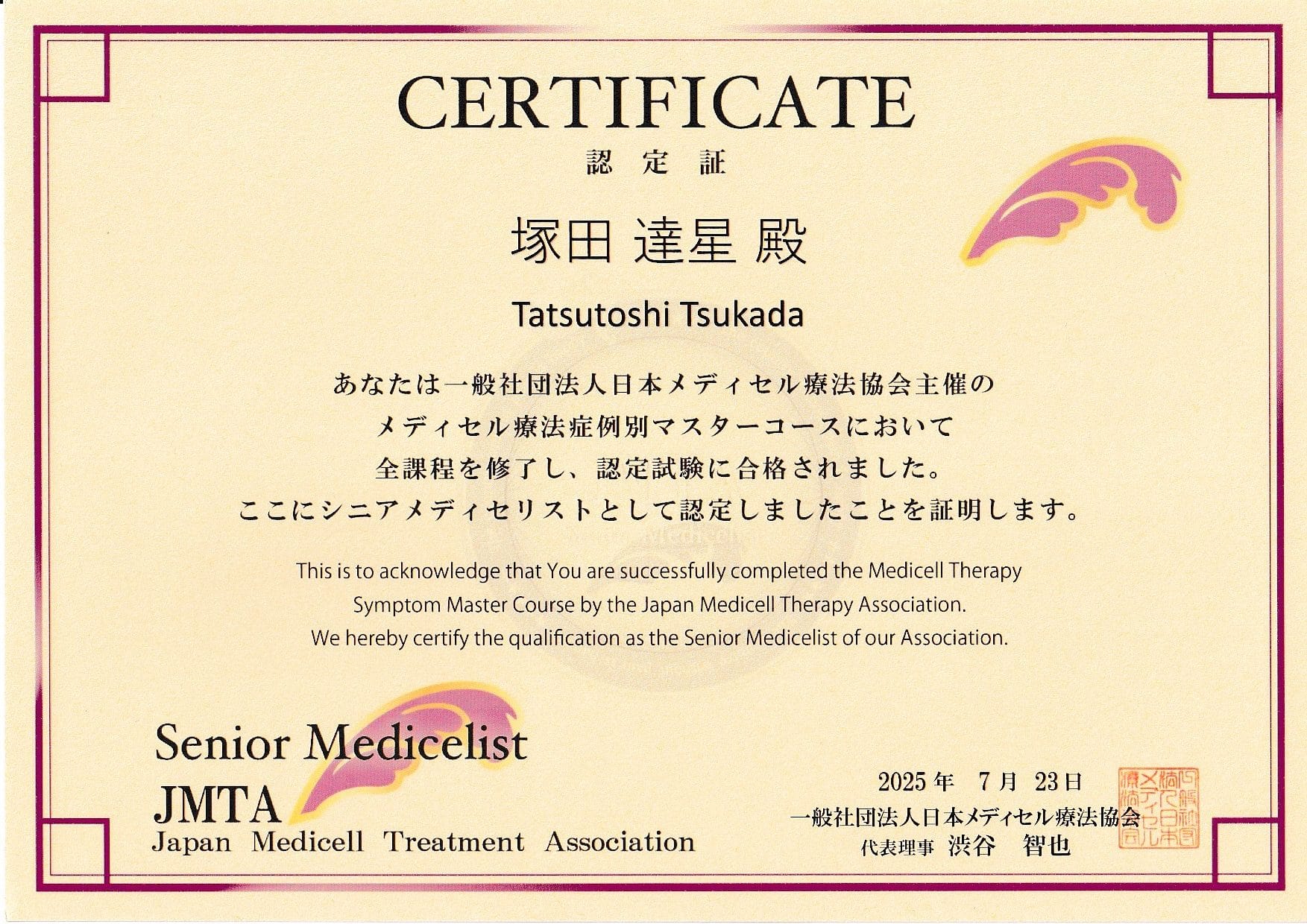 一般社団法人日本メディセル療法協会シニアメディセリスト認定証