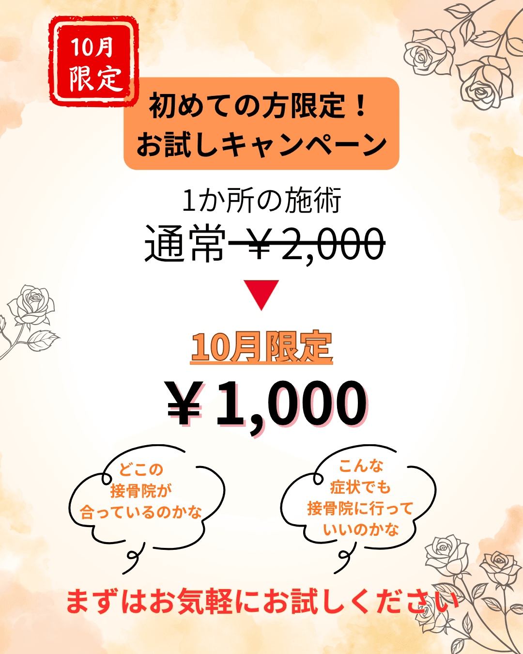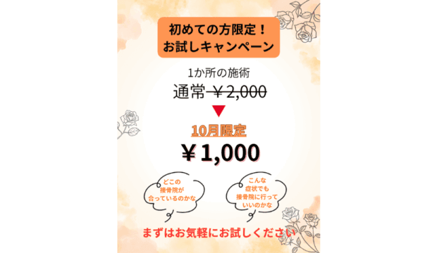 施術部位は1か所と制限はありますが、当院の施術を体験できるチャンスになっております!