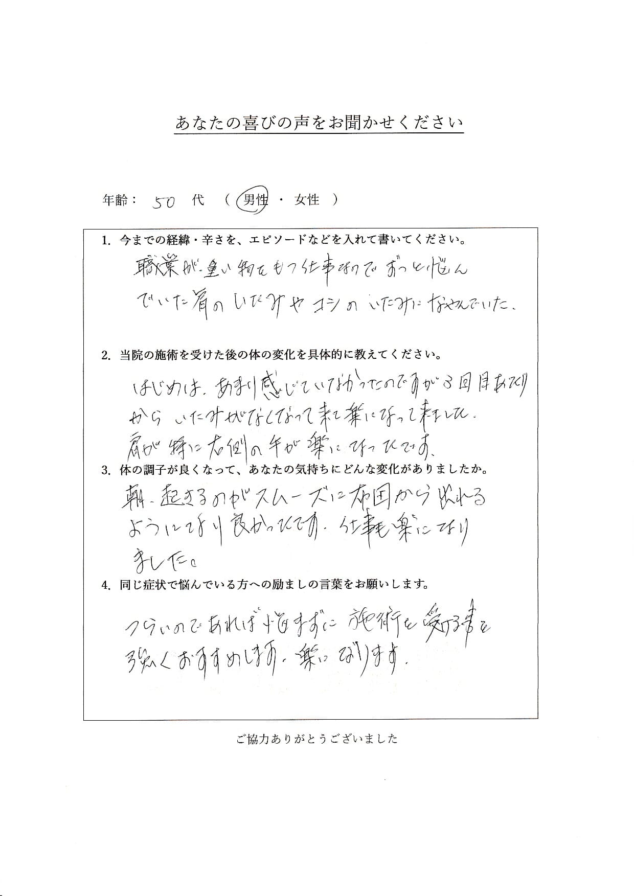 当院の施術により、肩や腰に痛みを感じることがなくなり良かったです。