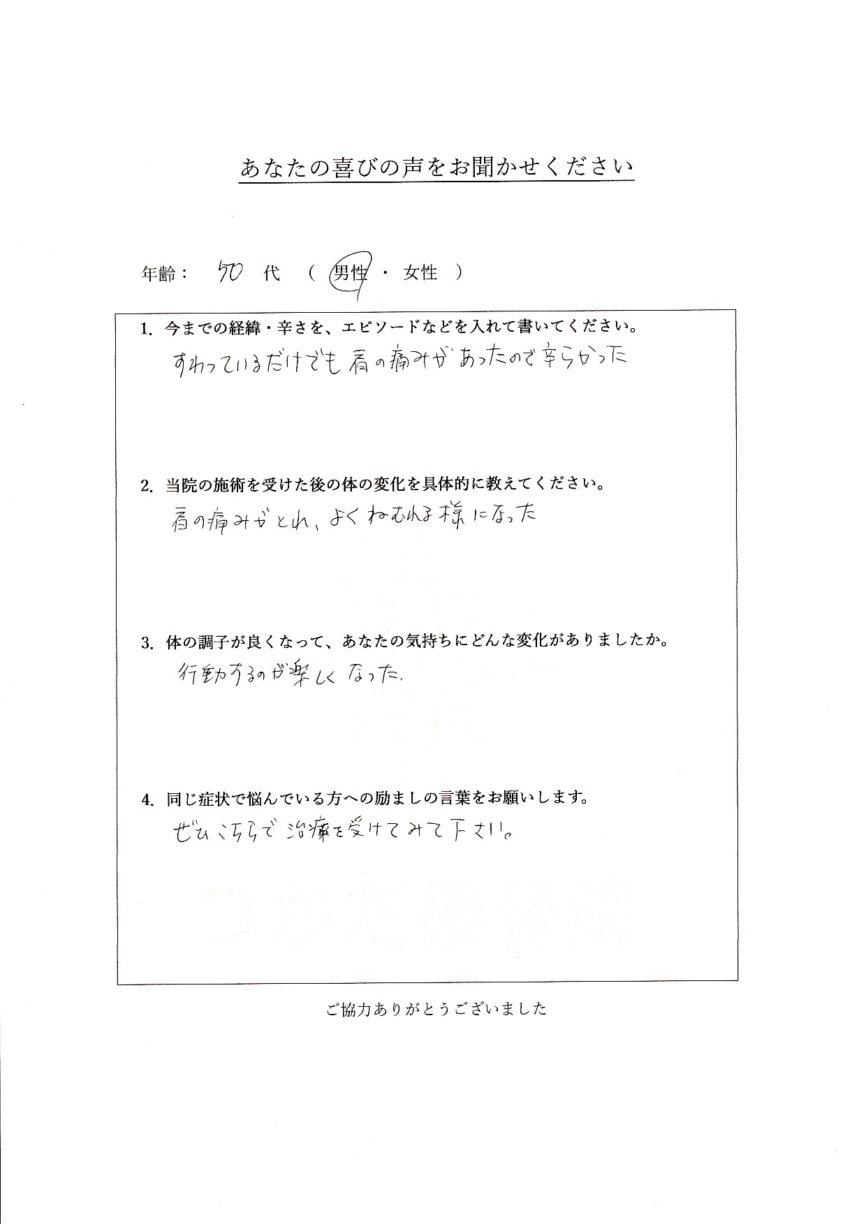 肩の痛みやしびれが改善したことで日常生活が過ごしやすくなったかと思います。