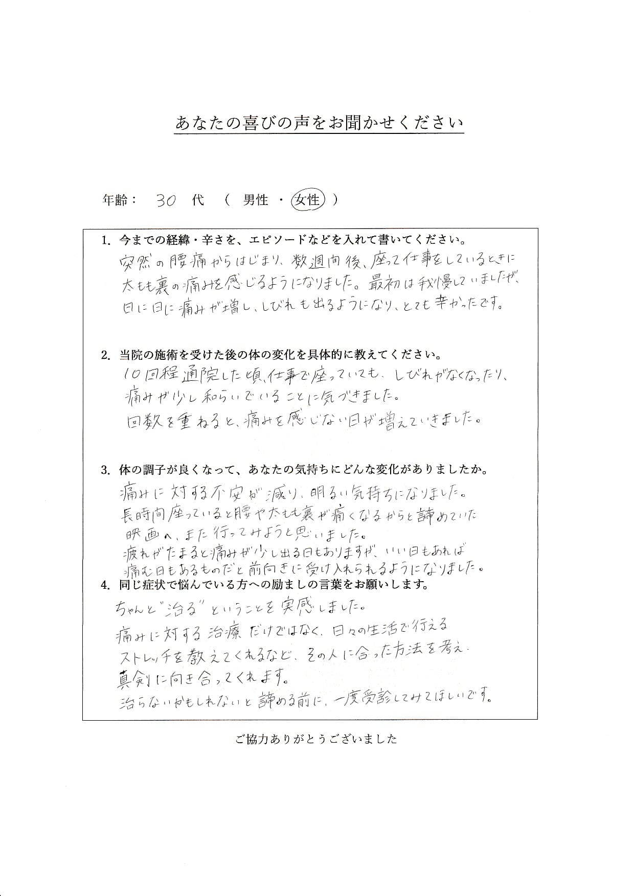 突然の腰痛からはじまり、数週間後、座って仕事をしているときに太もも裏の痛みを感じるようになりました。最初は我慢していましたが、日に日に痛みが増し、しびれも出るようになり、とても辛かったです。
